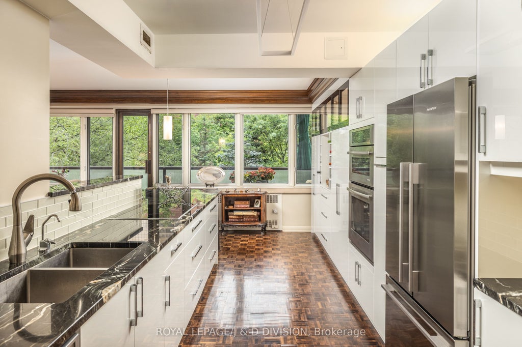 Welcome to Arbour Glen in the heart of South Rosedale! This rarely available three bedroom suite presents great value, with two full washrooms, is extremely spacious (1640 square feet), and very elegantly and beautifully renovated. The modern kitchen has been opened to the living room and dining room, and has been upgraded with high-end stainless steel appliances, laquer cabinetry and granite countertops with breakfast bar. The wall to wall custom built-ins in the kitchen include wine storage, pantry space, and backlit glass display cabinets. The living and dining area walks out to a west facing balony. The suite offers hardwood floors throughout, raised panelling, wooden crown moulding, and extensive recessed halogen lighting. The third bedroom is currently being used as a den but can be closed for privacy with louvred doors, and has a lovely picture window with south views. Down the hall is a laundry room, incredibly rare for this building, with stackable laundry, a laundry tub, and built-in shelves for ample storage. The second bedroom has a double closet, wall-to-wall bookshelves, and and a three piece washroom across the hall. Both the second bedroom and the primary bedroom walk out to the south-facing balcony. Finally, the primary suite has a double mirrored closet and a three piece ensuite washroom. The large locker is located on the same floor and the suite. Excellent building amenities include; 24 hour concierge/security, a recently expanded gym with brand new equipment, heated outdoor saltwater pool, and visitor parking. Conveniently located just steps to transit for an easy commute downtown, shopping and restaurants, Yorkville is just steps away, yet this building is tucked away right in this lush ravine setting.