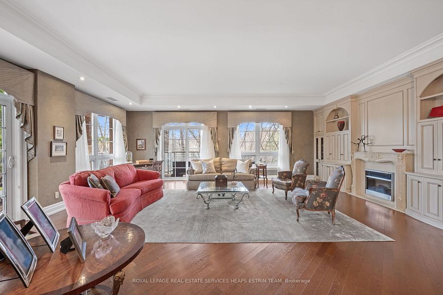 Welcome to suite 117, a rare offering, with 2500 sq. ft of exceptional interior living space with an additional 2080 sq. ft terrace with barbecue and gas line and private lawns. An exceptional bungalow alternative with every amenity at your doorstep and is the true pinnacle of sophisticated living. The welcoming foyer boasts soaring ceiling heights with a double closet. The renovated eat-in kitchen features custom cabinetry with Ceasarstone countertops, breakfast bar, breakfast area, and overlooks the family room with custom built-ins and walk-out to the expansive terrace. The spacious living room and dining room is perfect for entertaining with hardwood floors, custom millwork, gas fireplace w/ two walk-outs to the gardens. The primary retreat boasts hardwood floors, coffered ceiling, walk-in closet and a four piece ensuite with glass enclosed shower, deep soaker tub and large vanity with marble countertops. The second bedroom is well appointed w/ crown moulding, custom built-in closet and drawers, and a three piece ensuite. The den creates the perfect home office w/ custom millwork and a built-in desk. The powder room and large laundry room complete this stunning suite. Three large lockers are included, and two wide and well placed parking spots.
