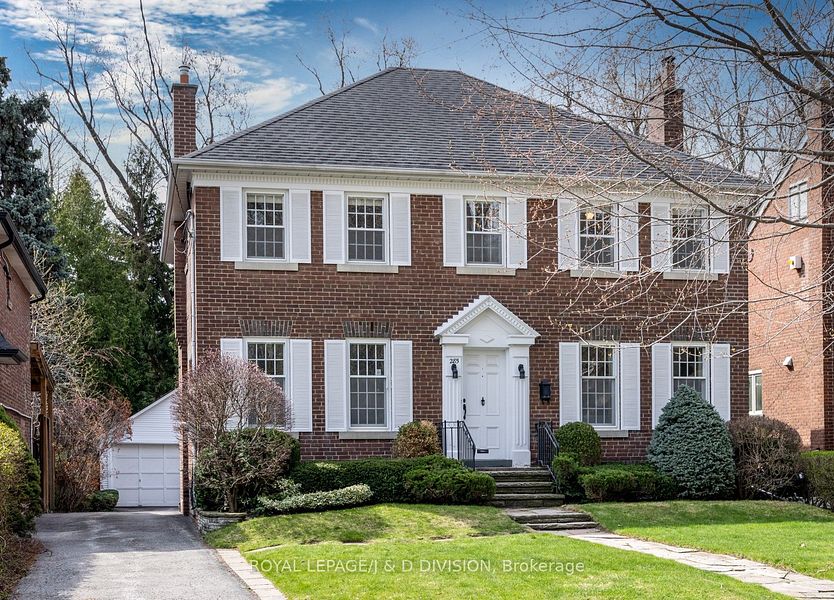A gracious home cherished and meticulously cared for by the same family for decades. Two-storey centre hall home sits on a 44' x 150' private south facing lot. The home features exceptional space and flow, crown moulding, wainscotting and hardwood on two floors. The property is bathed in natural light with many rooms having windows on two walls. The grand living room, with its wood burning fireplace has a den/family room connected to it with walk out to a covered porch and the dining room has two oversized windows. The kitchen features wood cabinetry, an eat-in area and access to the south garden. The second floor offers an unusually large layout with four well-sized bedrooms, including the primary suite, with three-piece ensuite. The other three bedrooms utilize the four-piece bathroom. The lower level can be accessed by two separate staircases - recreation room with fireplace, built in desk, wall to wall closets, laundry room, excellent storage and above grade windows. Architectural details enhance the home's significant street presence, including the symmetrical facade of oversized windows, classic all red brick exterior, a double detached garage, a long private drive with ample parking and a deep south facing - private fenced landscaped garden. Located in the coveted Lawrence Park community, walking distance to several neighbourhood parks, close to top private schools and a short walk to Blythwood Public School. This four bedroom home offers exceptional versatility offering a unique opportunity to move-in, renovate, or add on... limitless potential. This is a wonderful opportunity for a family to personalize the space to fit their lifestyle.