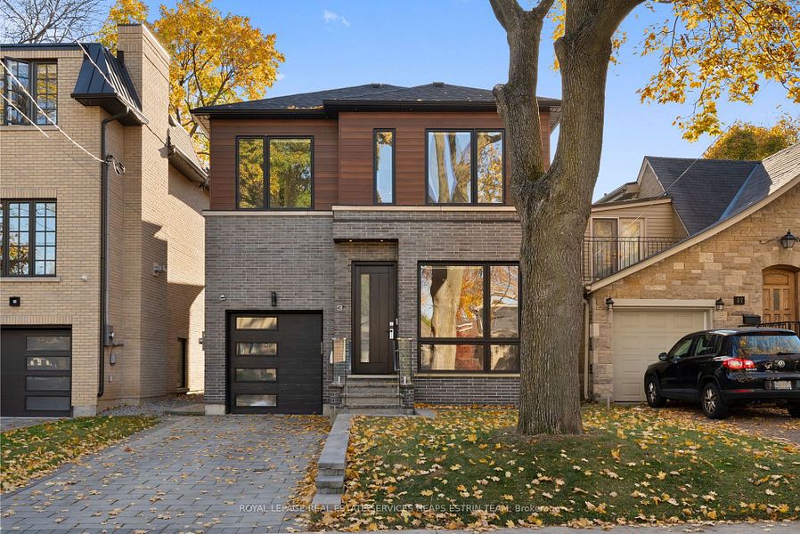 Welcome to 39 Sharron Drive, a stunning custom-built home nestled on a quiet street in the heart of South Leaside, one of Toronto's most cherished neighbourhoods. This exquisite residence seamlessly blends modern elegance with timeless sophistication, offering an unparalleled living experience. The home's striking brick and wood façade captivates immediately. A built-in garage enhances convenience while complementing the home's stylish exterior. Inside, wide plank wood floors flow throughout, and a dramatic sky lit staircase bathes the space in natural light. The living room boasts hardwood floors, high ceilings, and a gas fireplace, creating a cozy yet sophisticated ambiance. Adjacent is the elegant dining room, featuring bespoke built-ins and a statement chandelier, perfect for hosting memorable dinners. At the heart of the home, the gourmet kitchen showcases a large stone waterfall island, top-of-the-line appliances, and abundant storage. The adjoining eat-in area overlooks the backyard, while the family room, with custom millwork and a gas fireplace, is ideal for relaxation. The sky lit staircase leads to a serene upper level, where the primary suite offers a tranquil retreat with two walk-in closets and a spa-like ensuite featuring stone finishes, a steam shower, and a freestanding tub. The second bedroom includes a private ensuite, while the third and fourth bedrooms share a 3-piece bathroom. The lower level is designed for both luxury and functionality, with a spacious recreation room, gas fireplace, wet bar, and wine cellar. A fifth bedroom, versatile den, and additional 3-piece bathroom make it ideal for guests or extended family. The landscaped backyard oasis includes a stunning pool, patio, and manicured greenery. Located near top-rated schools, parks, and amenities, 39 Sharron Drive offers the pinnacle of Leaside living, combining elegance, comfort, and thoughtful design.