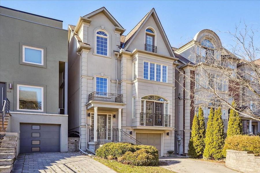A stunning four bedroom detached home with beautiful curb appeal, private drive and built-in garage. It offers all of the quiet comforts of a vibrant neighbourhood just steps away from the amenities in midtown Toronto. This expansive three storey home offers the perfect layout and is flooded by natural light. The foyer leads into the open concept living and dining room w fireplace, wall panelling, crown moulding; making it perfect for entertaining. The kitchen is complete with breakfast bar and stainless steel appliances. The upper level offers three well proportioned bedrooms with ample closet space and access to a four piece bathroom. As you ascend to the third level, you retreat to the primary suite with soaring cathedral ceilings, a five piece ensuite and large walk-in closet, complete with a Juliette balcony that opens to a view of the park and cityscape beyond. A lower level boasts a rec room with direct access to the garage, a four-piece bathroom and w/o to the private gardens.