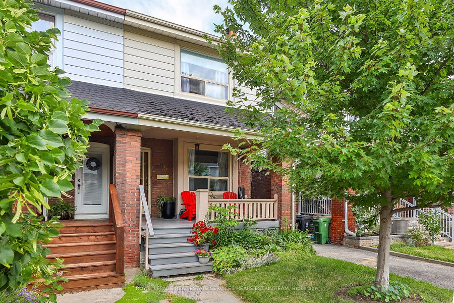 A charming three bedroom semi-detached home. The main level offers a foyer that opens up through glass French doors into a bright living room featuring broadloom, a brick fireplace and leaded glass windows. The dining room opens up to the living room and is connected to the eat in kitchen offering the ideal space for family dinners and entertaining. The second level boast three well proportioned bedrooms each with a closet that share a four-piece bathroom. Shared laundry is located on the lower level. Access to a backyard storage shed is available. Located in a quiet and friendly neighbourhood steps from great schools, the TTC and in close proximity to all the shops and amenities of the Danforth.