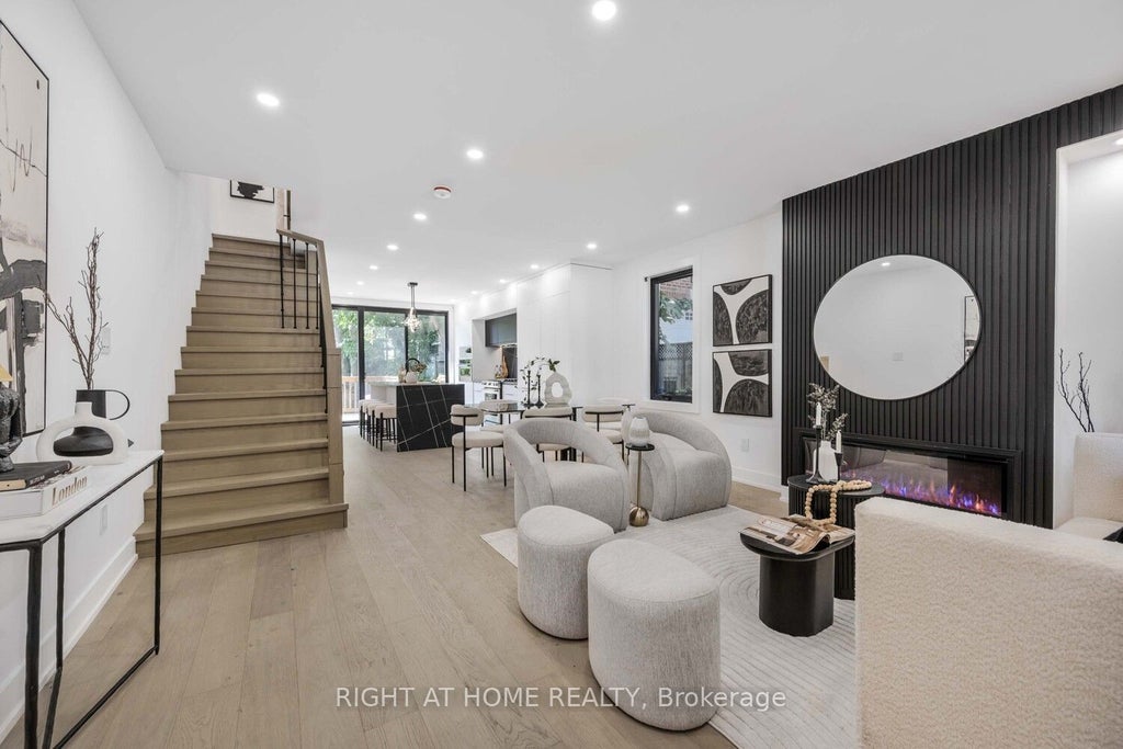 Welcome to this stunning reimagined luxury 2.5-storey residence in the heart of The Beaches. Offering approx. 1,880 sq. ft. of refined living space, this home features 3 spacious bedrooms plus a versatile loft that can serve as a 4th bedroom, 4 beautifully designed bathrooms, and a fully finished walkout basement with its own kitchen. Renovated from top to bottom, this home combines timeless design with modern convenience, showcasing engineered European wide-plank hardwood, refined millwork, sleek matte finishes, and a striking feature wall with an elongated fireplace. The custom chefs kitchen showcases Italian Sahara slab counters with an oversized waterfall island, Fulgor Milano & KitchenAid appliances, and designer lighting ideal for entertaining. Dramatic 10-ft sliding doors open to a landscaped backyard oasis with custom deck, interlocking, and stone patio. A private driveway with 2 parking spaces adds rare convenience. Upstairs, bright bedrooms include custom closets, spa-inspired bathrooms with Italian tile, and a primary suite with a glass shower and brushed-gold fixtures, while a second-floor laundry enhances daily living. With all-new mechanicals including a new furnace, 200-amp service, plumbing, waterproofing, and smart-home features, this turnkey home provides peace of mind. Steps to Queen St., Kew Gardens, and top schools including Williamson Rd. (French Immersion), and less than a 10-minute walk to sandy beaches and the boardwalks that define this lifestyle.