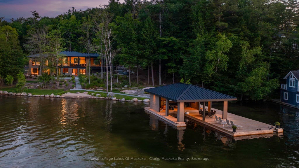 Location! Location! Location! This stunning 5-bedroom, 4-bathroom lakefront sanctuary embraces an open and airy design that seamlessly blends modern elegance with cozy comfort. Situated on 4.7 acres of gently sloping, beautifully landscaped terrain along the pristine waterfront on South Lake Joseph, the home boasts a captivating northeast exposure that allows natural light to pour in through the expansive floor-to-ceiling windows from every angle.The architectural details, featuring a harmonious mix of oak wood, MDF, and stone, create a warm and inviting ambiance throughout the living spaces. At the heart of the home lies a designer kitchen that impresses with its Dekton wall detailing, offering a breathtaking vista of the lush natural surroundings, and anchored by a stunning waterfall island, perfect for casual dining and entertaining. Adding to the home's cozy charm are two custom-stone surround gas fireplaces gracing the main floor, while the spacious 4-season Muskoka Room provides a tranquil retreat for relaxation. Descending to the lower level, you'll find walkouts from the family room and bedrooms, expanding the living space and seamlessly connecting the indoors with the picturesque outdoor oasis.The site plan also allows for the addition of a coach house with accommodation, offering even more flexibility and value to this already incredible property.Completing this idyllic lakefront retreat is a single slip, single-storey boathouse and a private beach area, all conveniently located just minutes from the charming amenities of Port Carling. 170 feet of surveyed shoreline frontage, This exceptional property truly offers the perfect blend of luxury, comfort, and unparalleled natural beauty, making it the ultimate lakeside sanctuary.